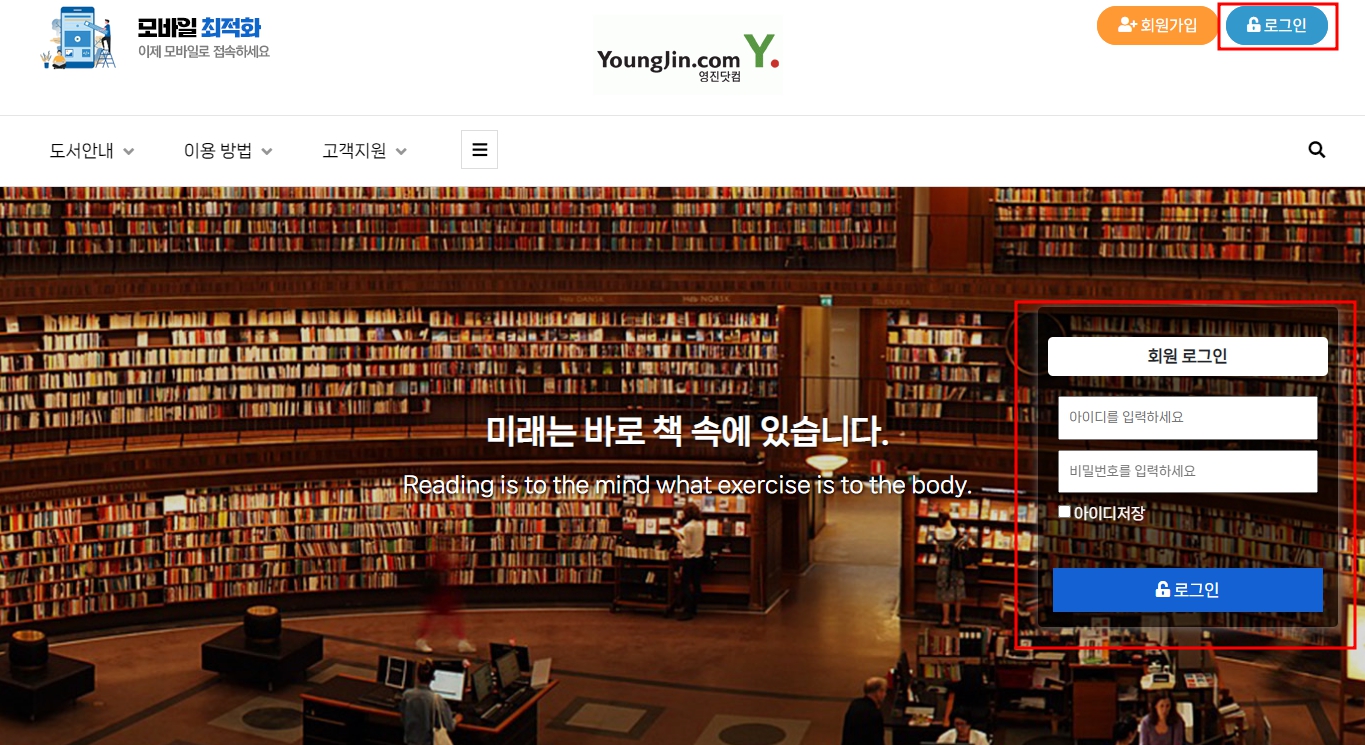 우측 상단에서 로그인 버튼을 클릭 하시거나 메인 페이지 로그인 영역에서 로그인을 합니다.