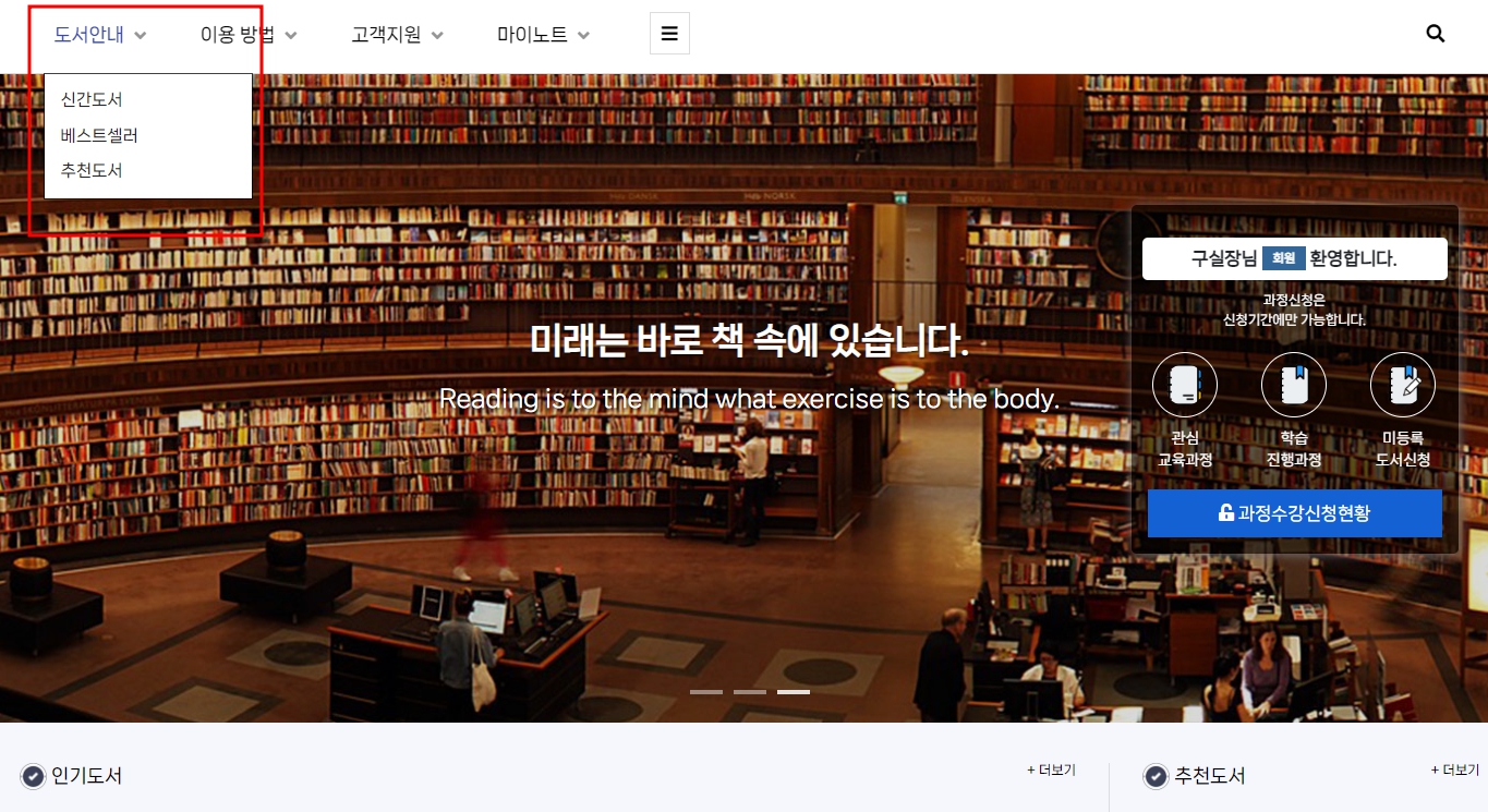 상단 메뉴에서 도서안내 메뉴에 등록된 메뉴를 클릭(Click) 하신 후 도서 리스트에서 검색등을 이용하여 도서를 검색합니다.