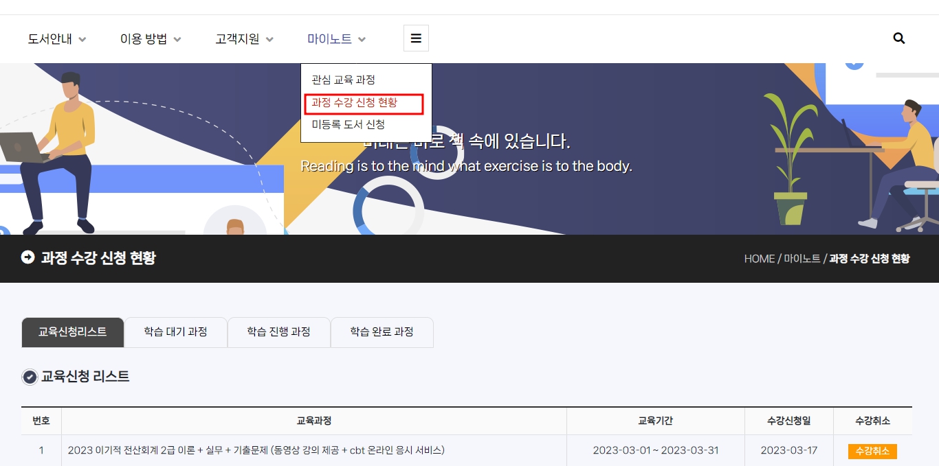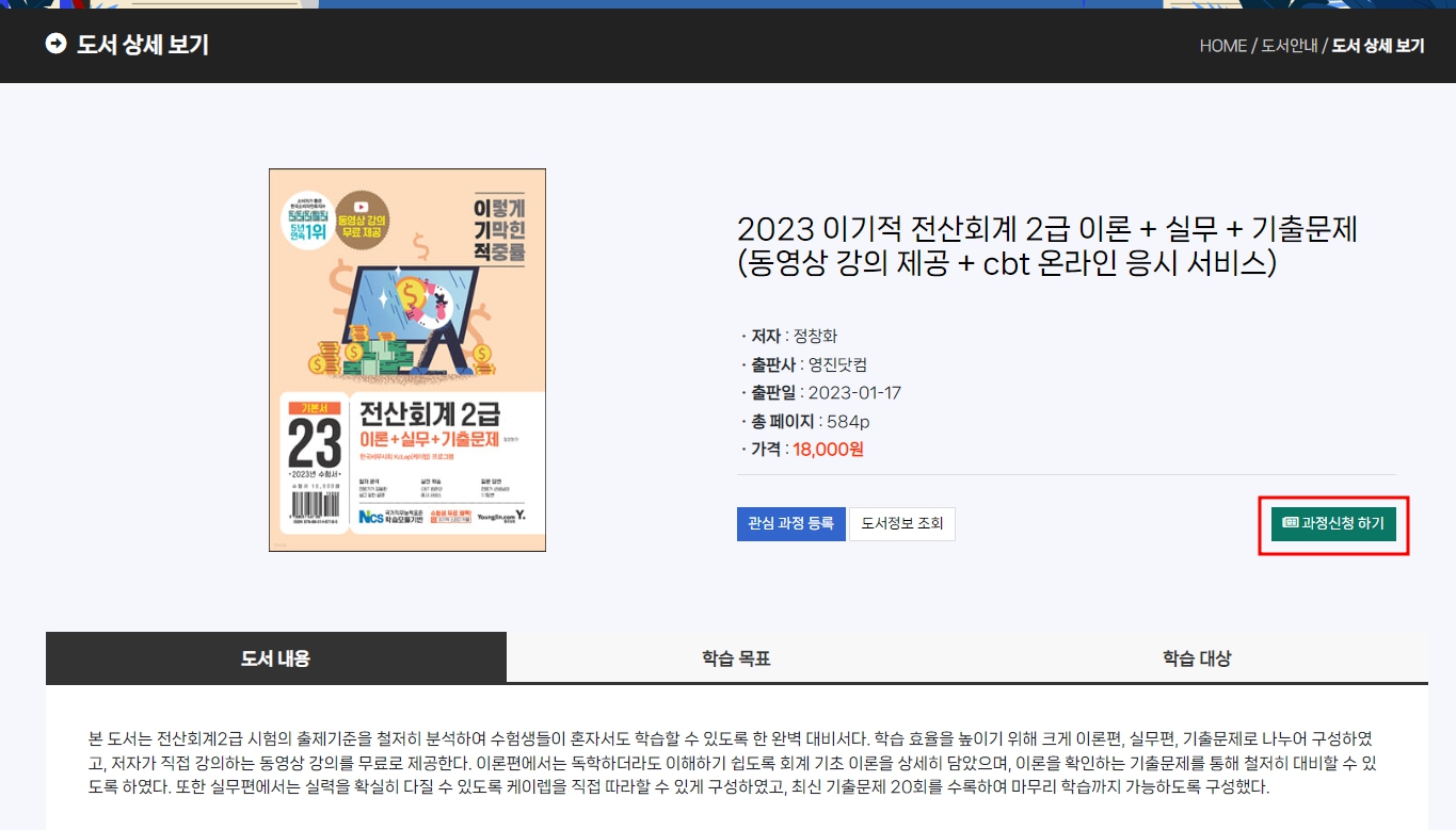 검색된 도서의 상세보기 화면으로 접속하시면 "교육신청 기간동안" "과정신청하기"버튼이 활성화 됩니다.