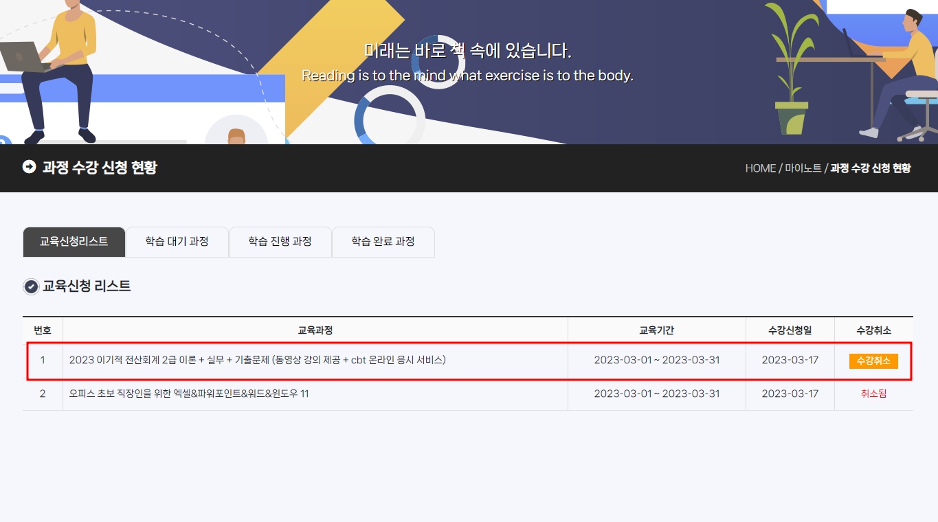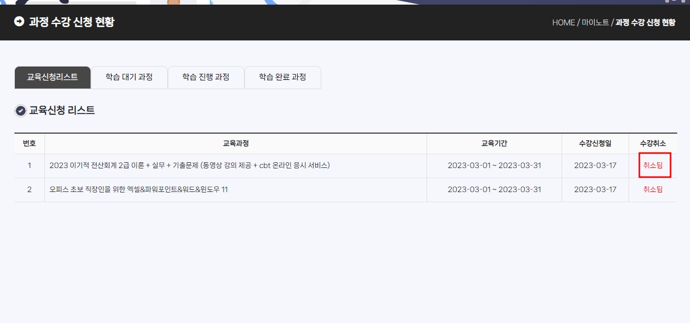 마이노트 > 과정 수강 신청현황 > 교육리스트에서 수강취소 메뉴에 "취소됨" 이라고 붉은색 표기가 되면 취소가 된 상태입니다.