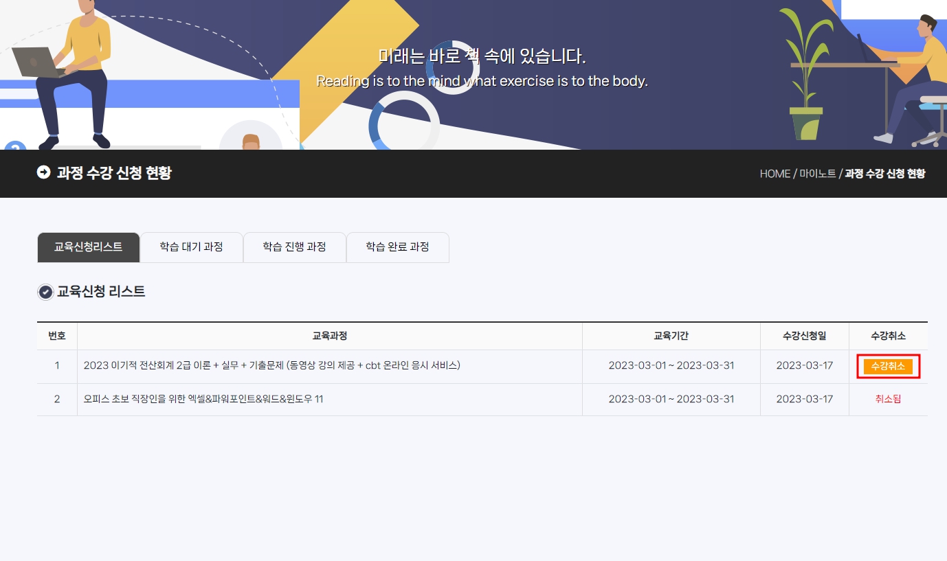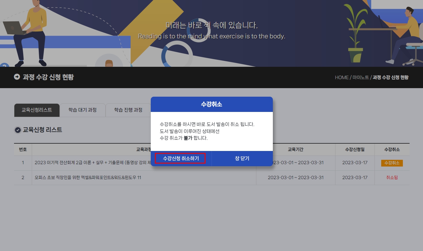 학습 진행 과정으로 넘어가기 전까지는 "수강취소" 버튼이 활성화 되어 있습니다.