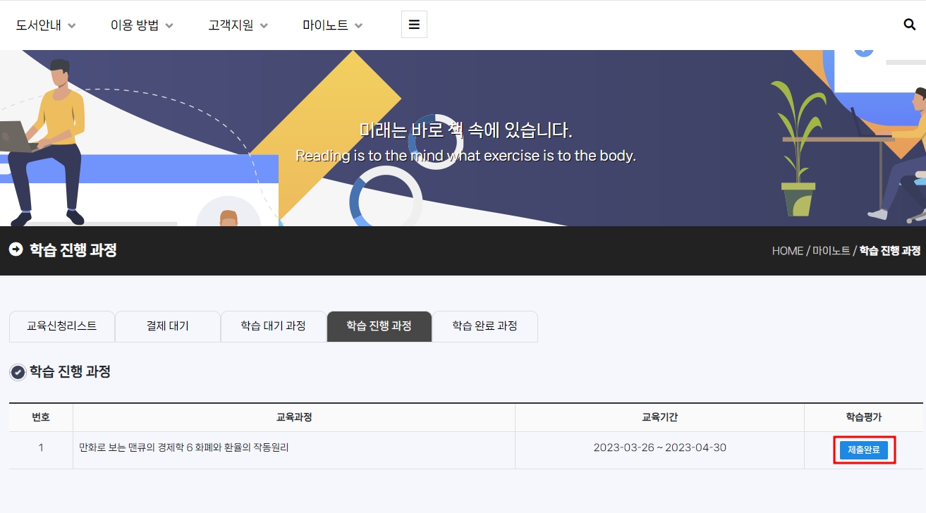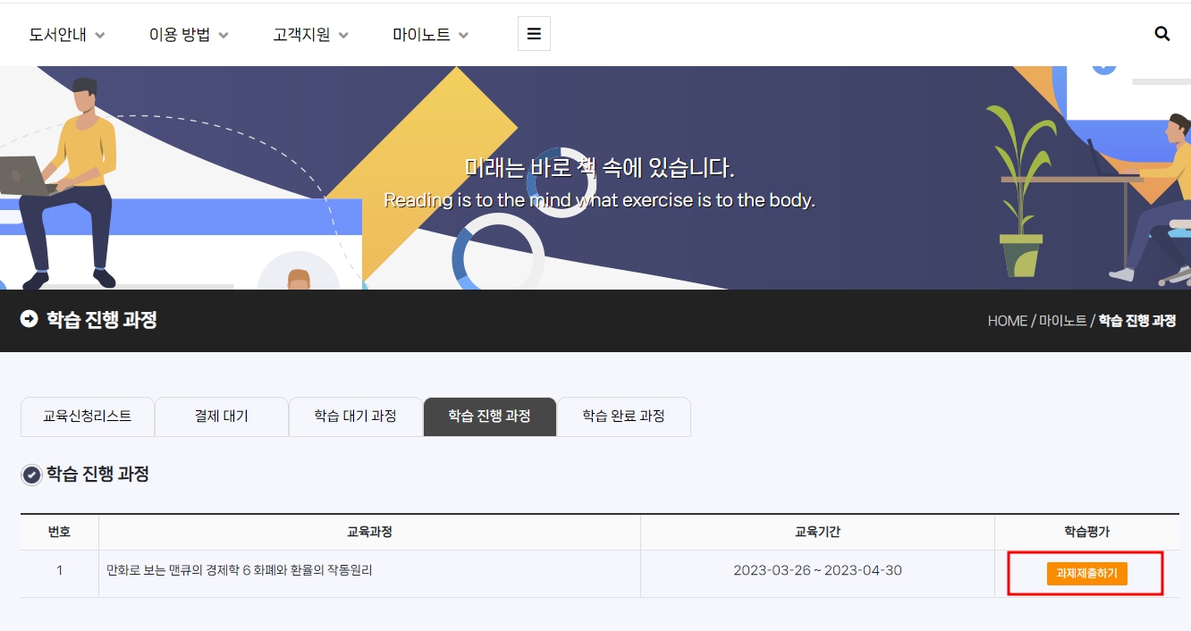 회원인증 > 마이노트 > 학습 진행 과정에서 과제제출하기를 클릭 합니다.