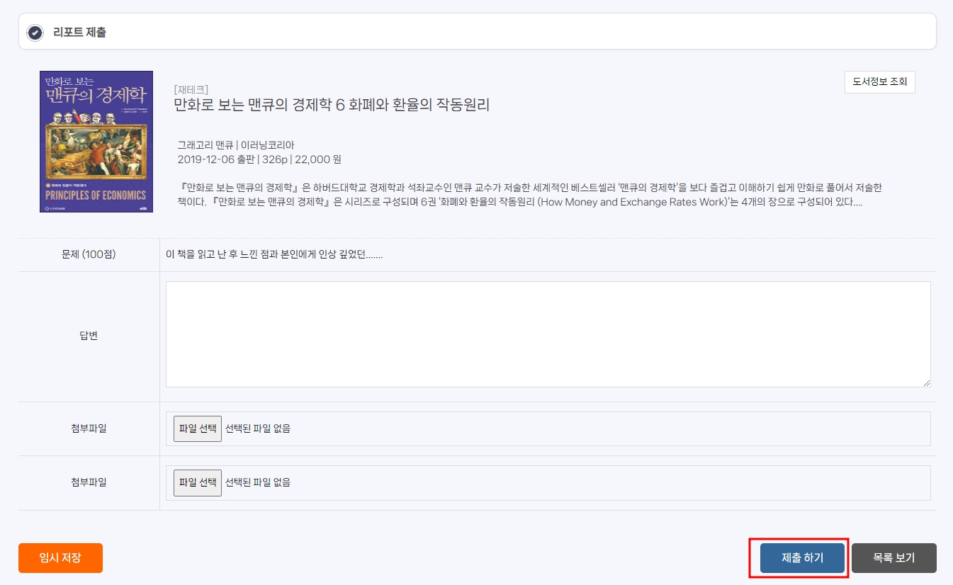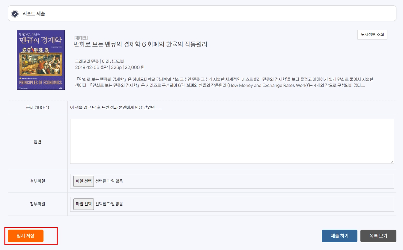 과제로 읽은 책에 대한 리포트를 제출 합니다. 한번에 작성이 어려우실 경우 임시 저장 버튼을 클릭 하시면 임시로 저장이 됩니다.